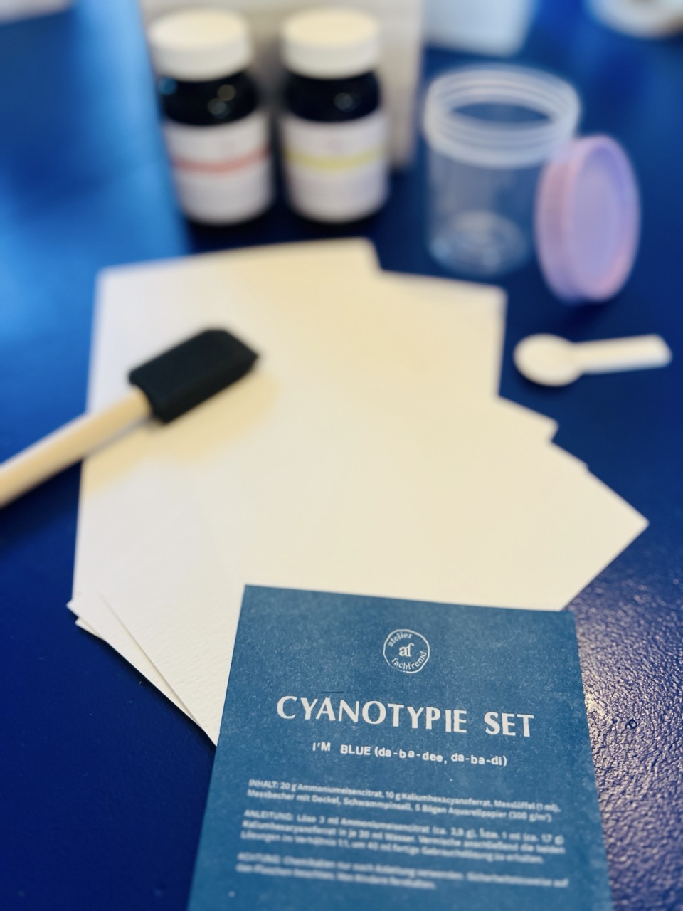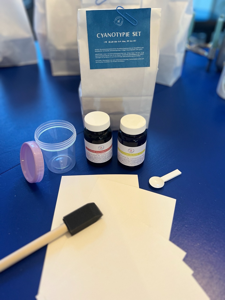 In diesem Set ist alles enthalten, was ihr zum Durchstarten zu Hause braucht – ob mit Workshop oder ohne: Die beiden Chemikalien, ein Messbecher mit Messlöffel, ein Schwammpinsel und ein paar Bögen Aquarellpapier für eure ersten Fotogramme! Eine Mini-Anleitung steht auf dem Etikett (übrigens auch eine Cyanotypie!).