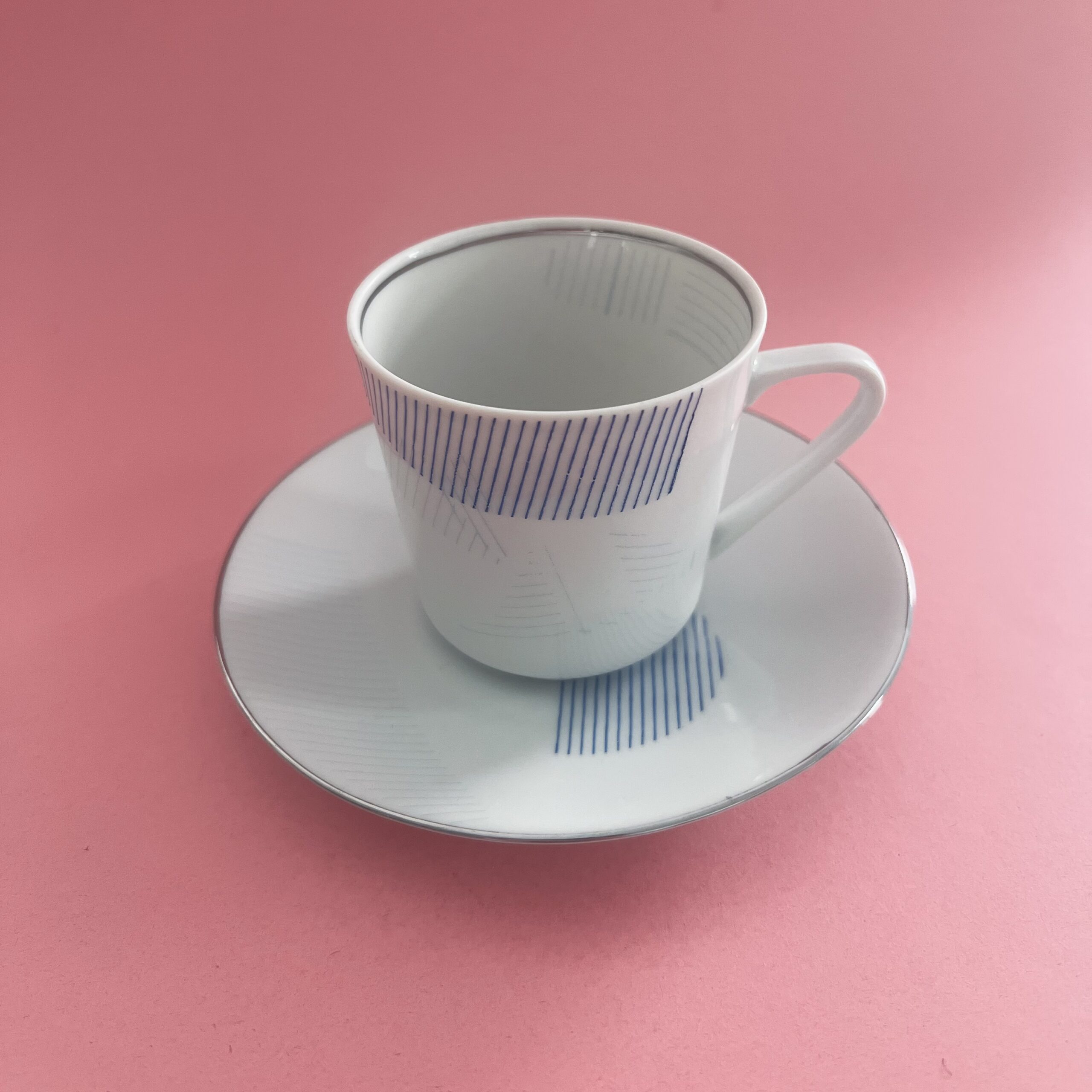 Bedruckte Vintage-Tasse mit Untertasse aus Porzellan mit permanentem Druck in unterschiedlichen Blautönen (keramischer Siebdruck im Transferverfahren).