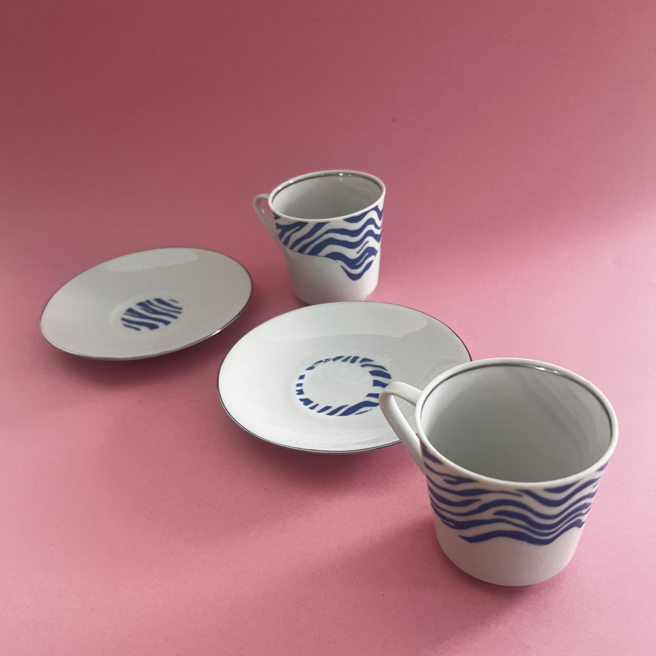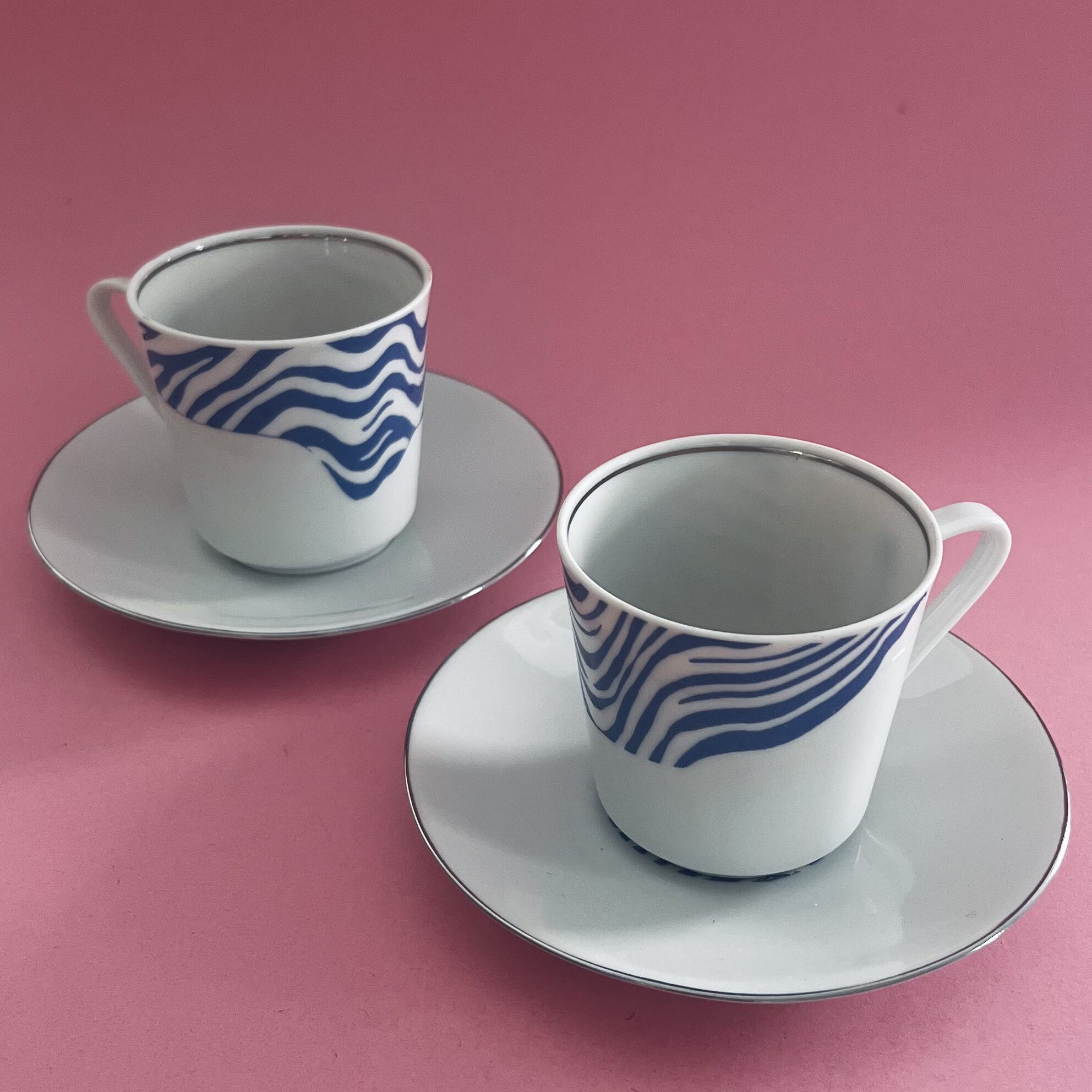 Bedruckte Vintage-Tasse mit Untertasse aus Porzellan mit permanentem Druck in blau (keramischer Siebdruck im Transferverfahren). Der Preis bezieht sich auf eine einzelne Tasse mit Unterteller. Bei diesen Exemplaren ist der Druck an einzelnen Stellen etwas durchbrochen, darum kosten sie etwas weniger.
