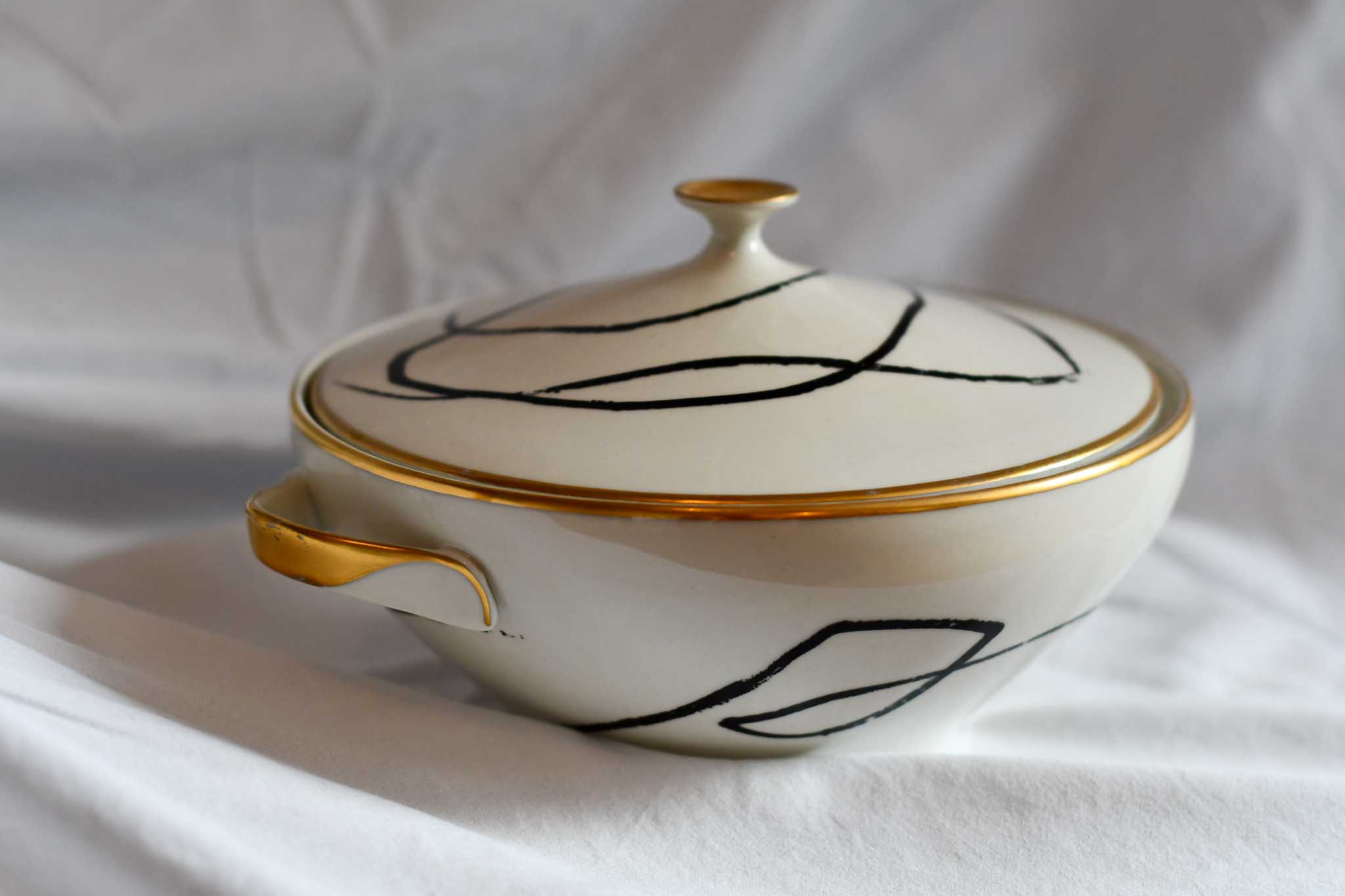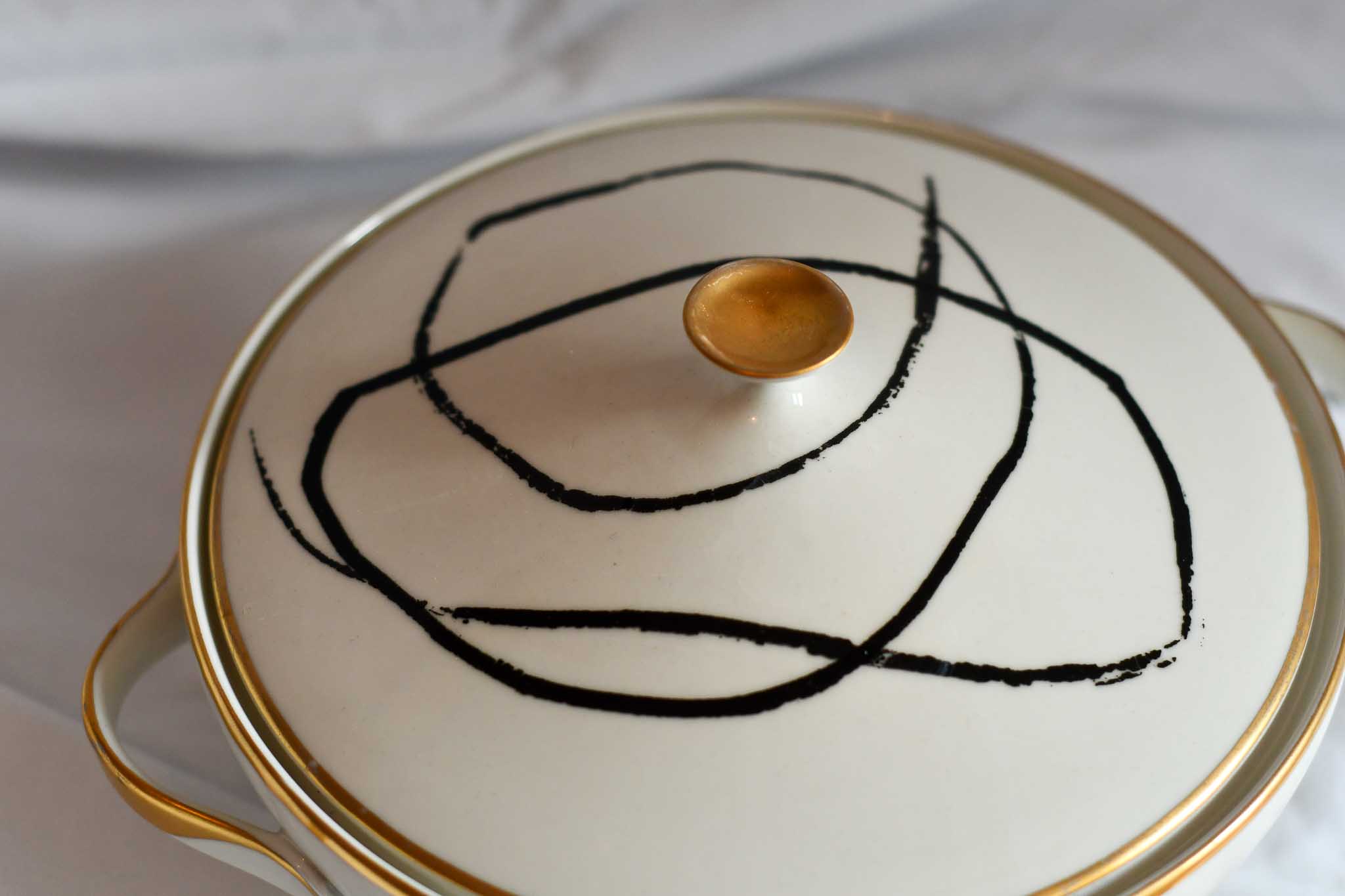 Vintage-Terrine aus Porzellan (Höhe ca. 10 cm, ø ca. 20cm) mit permanentem Druck in schwarz (keramischer Siebdruck im Transferverfahren).