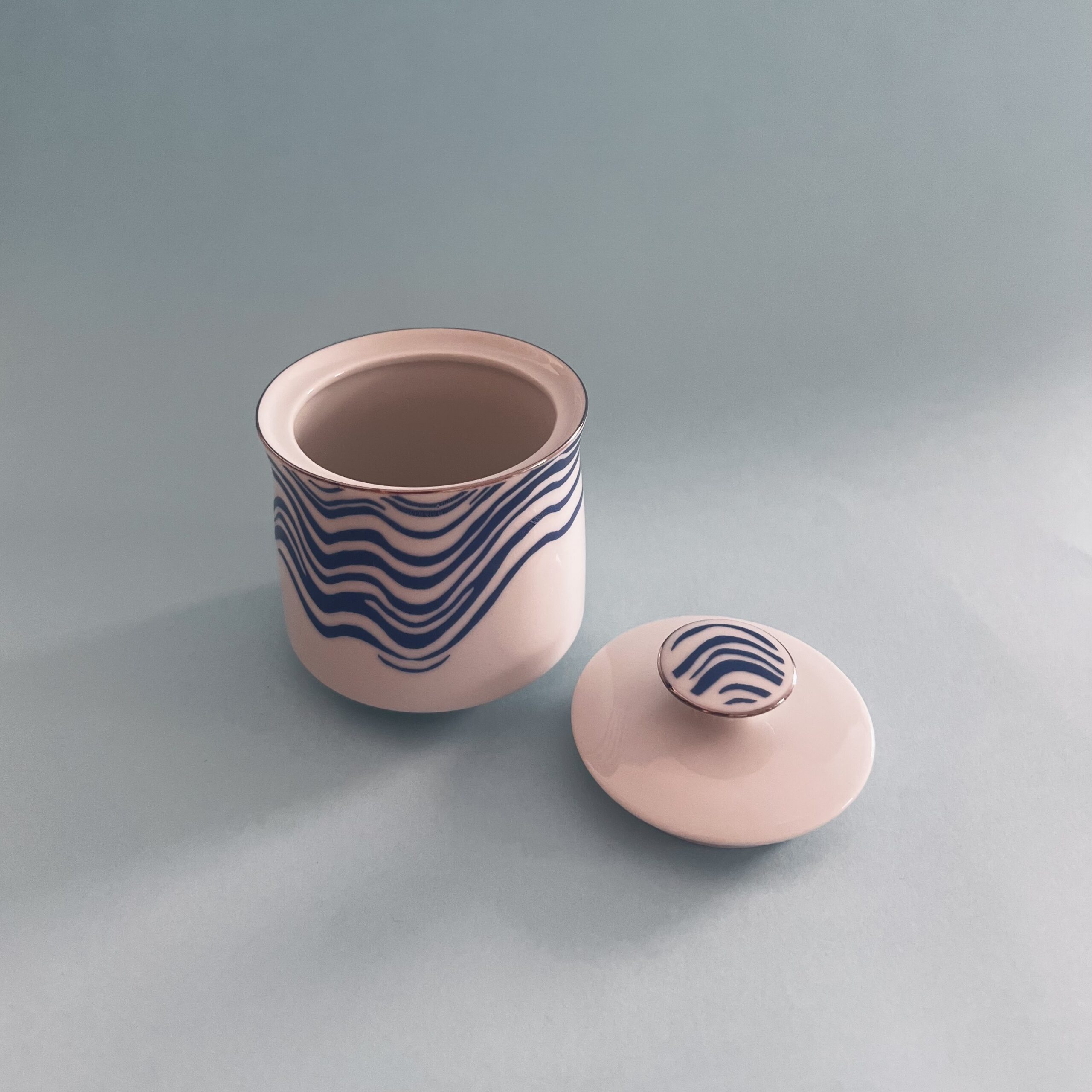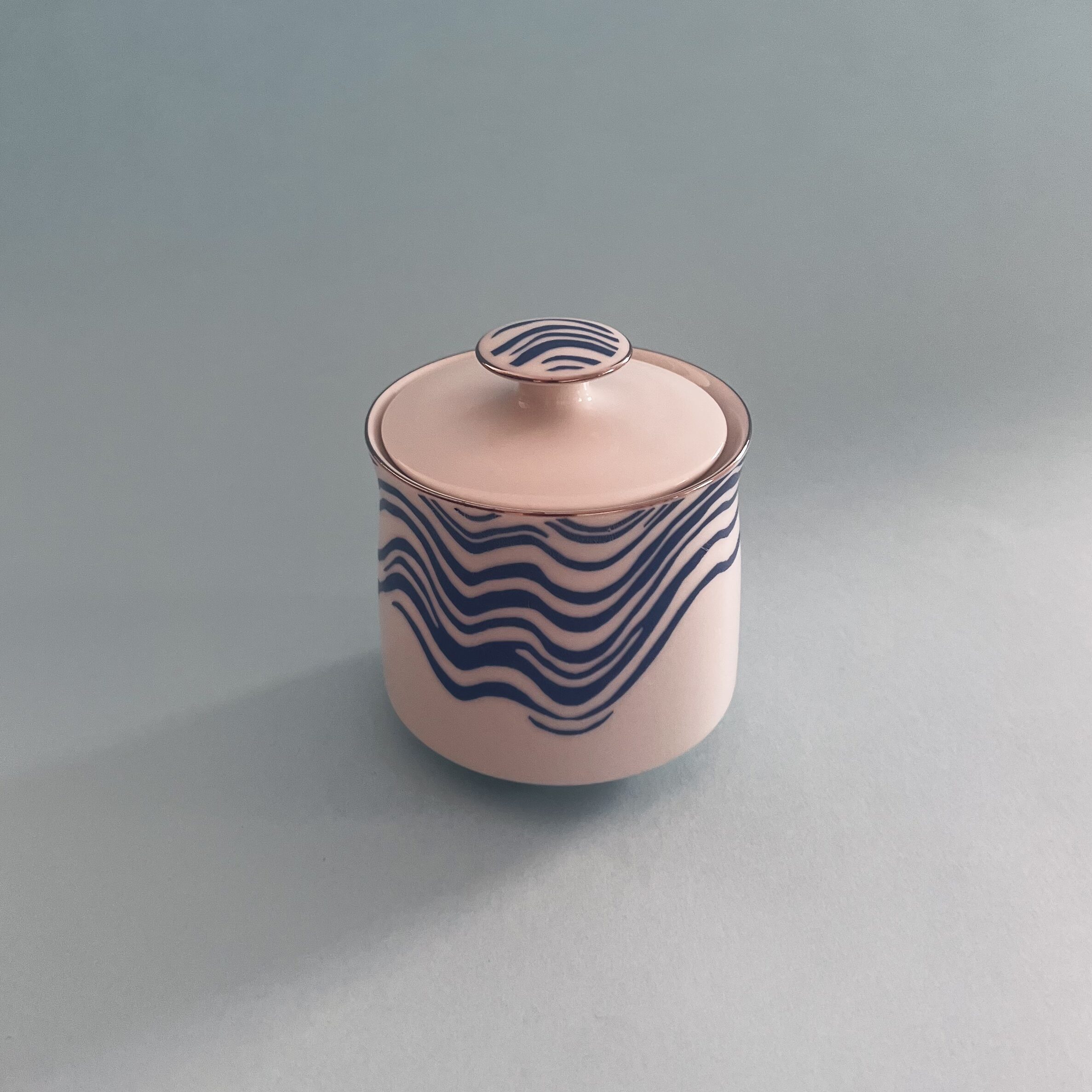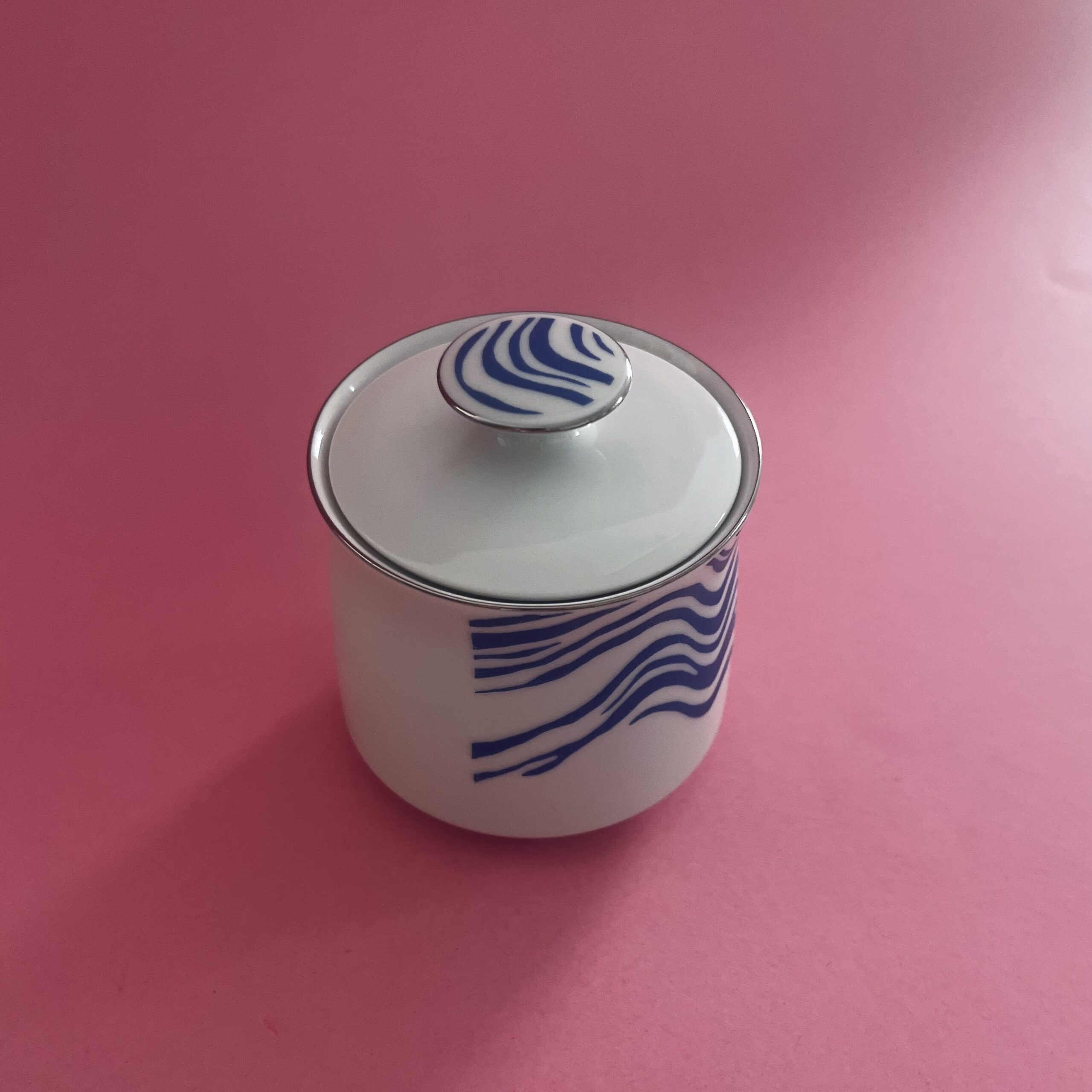 Vintage-Zuckerdose aus Porzellan mit permanentem Druck in Blau (keramischer Siebdruck im Transferverfahren).